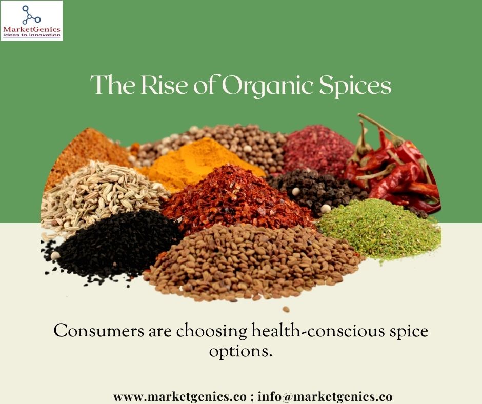 In a world market propelled more and more by health and nutritional consciousness, concern for the environment and responsible consumption, organic spices have become a significant force within the sustainable food movement. A dramatic shift is noted towards the organic spice industry as consumers look for dietary alternatives without chemicals. Clean-label packaging and organic farming are part of the organic spice industry boom, reflecting higher societal values of health and environmental concern. Let’s see what MarketGenics have to say on the spice industry.