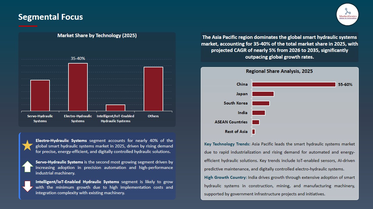 - The electro-hydraulic systems segment accounts for ~37% of the global smart hydraulic systems market in 2025, propelled by the use of actuators with integrated sensors and electronic controls that facilitate greater precision and energy efficiency.